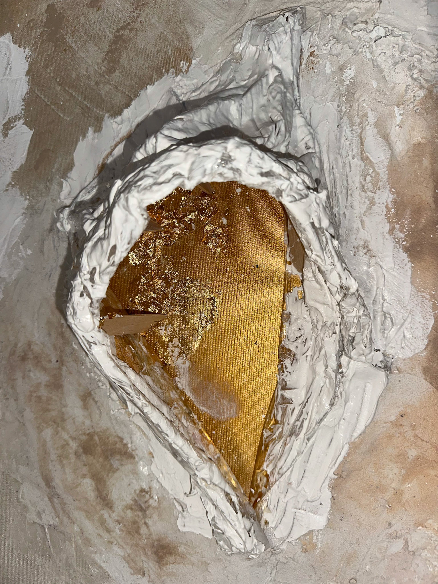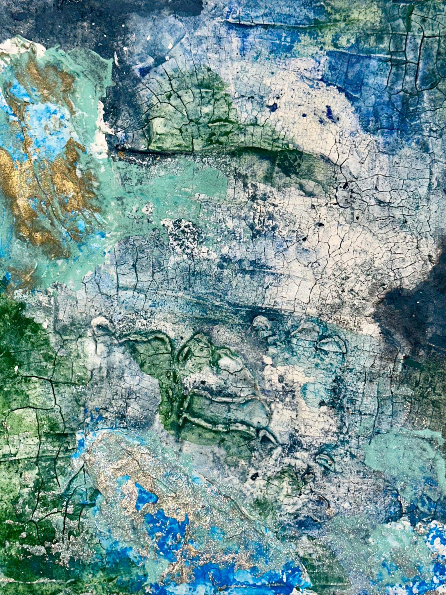 Created with marble paste, the technique emphasizes organic crackling across the surface. The textured layers rise and fall, creating a three-dimensional effect that mimics the sensation of moving beneath the ocean's surface—where water, light, and time shape everything. The cracks themselves resemble the formation of underwater ridges or the movement of oceanic plates, adding an element of ancient geological processes to the scene.